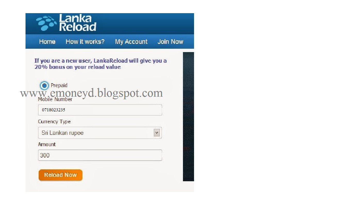 දැන් එහි Home මෙනුවට ගිහින් Mobitel, Dialog, Hutch , Etisalat , Airtel ආදී ඔබගේ ජංගම දුරකථන අංකය අතුළත් කර Currency Type එක Us ඩොලර් ද රුපියල් ද ආදී වශයෙන් තෝරන්න. දැන් Amount එක ඇතුළත් කරන්න. දැන් ඔබගේ දුරකථන අංකය නිවැරදිතාව හොදින් පරීක්ෂා කරගෙන Reload Now මත Click කරන්න පහත රූපය බලන්න.